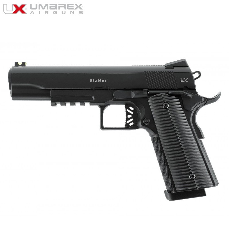 The Umarex BlaMer, a modernised twist on the classic 1911 design but keeping the iconic characteristics: A distinctive look, a large beavertail with integrated safety and a manual thumb safety. As a modern interpretation, it effortlessly meets today’s requirements for an enduring recreational pistol: the lightweight polymer construction allows extended use without becoming tiring, the blowback generates a realistic recoil and a clearly visible fiber optic front sight ensure accuracy. Visually, the commander-style hammer, skeletonized trigger and Picatinny rail give the UX BlaMer a tactical appearance.